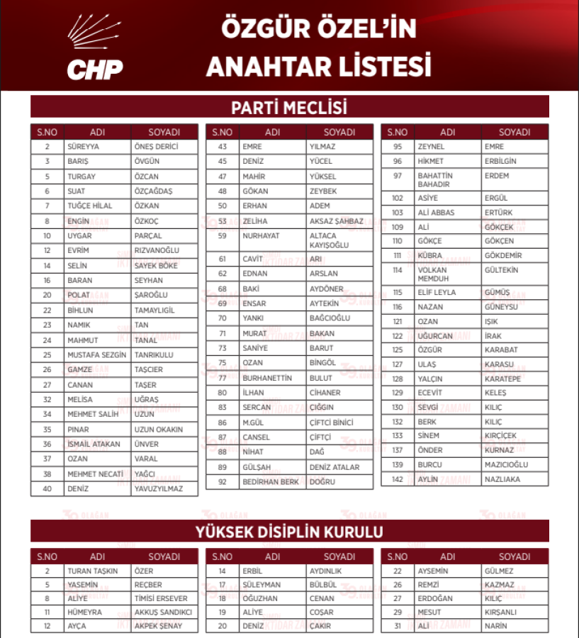 Edinilen bilgiye göre, dün yapılan genel başkanlık seçimlerinde dördüncü kez CHP Genel Başkanı seçilen Özgür Özel, mevcut MYK üyelerinin tamamını anahtar listesine aldı.