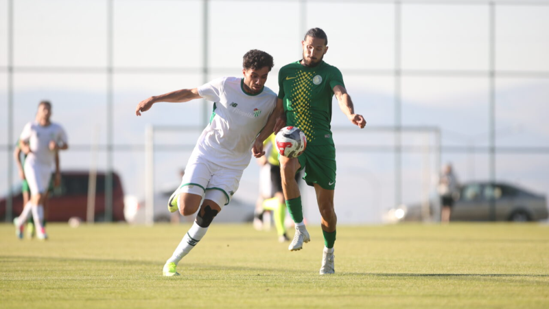 Nesine 2. Lig’de şampiyonluk hedefleyen Bursaspor, yeni sezon hazırlıkları kapsamında çalışmalarına Erzurum’da devam ediyor. Yeşil-beyazlı takım, kamptaki üçüncü antrenman maçında 2. Lig Beyaz Grup’ta yer alan Şanlıurfaspor’la karşı karşıya geldi. Mücadelenin 2. dakikasında kalesinde çok ciddi bir atak gören Timsah, Anıl Atağ’ın karşı karşıya pozisyonda yaptığı kurtarışla geriye düşmekten kurtuldu. Bursaspor ilk önemli atağı ise 14. dakikada yaşadı. Arka direğe yapılan ortada Ertuğrul Ersoy’un kafası az farkla auta gitti.