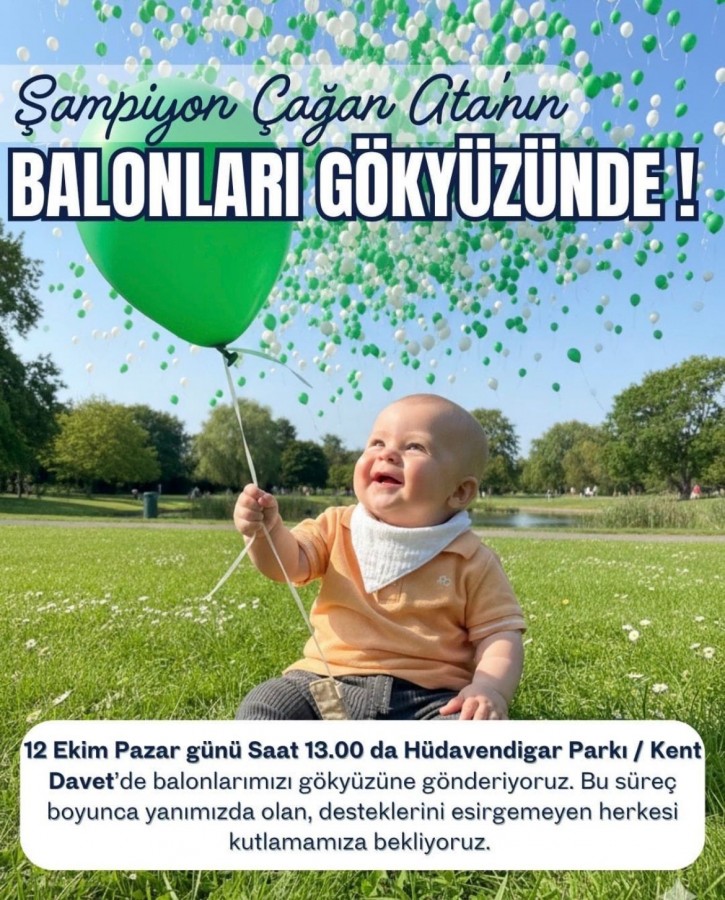Bursa'da ikamet eden Aleyna ve Ahmet Miraç Taran ailesinin 6 aylık bebekleri Çağan Ata'a 18 günlükken SMA'nın en yaygın ve ağır türü olan Tip-1 (Werdnig-Hoffmann) teşhisi konuldu. Taran çifti, valilik onayıyla başlattığı kampanyada mutlu sona ulaştı. Bu süreçte önemli bir destek sağlayan Bursaspor eski yöneticisi Hakan Dinçtürk, koordinesinde önemli bir etkinliğe imza atılacak. Pazar akşamı saat 19.00'da Atatürk Spor Kompleksi Matlı Stadyumu'nda oynanacak olan Bursaspor-Menemen FK maçında Çağan Ata için 20 bin balon gökyüzüyle buluşacak.