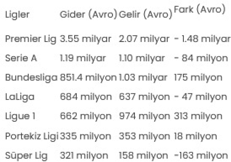 3,6 milyar avroluk harcamasıyla çıtayı biraz daha yukarı çeken Premier Lig'i 1,19 milyar avro ile Serie A, 851 milyon avroyla da Bundesliga ekipleri izledi.