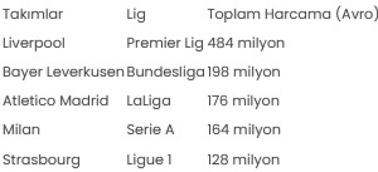 İngiltere'de Liverpool, Almanya'da Bayer Leverkusen, İspanya'da Atletico Madrid, İtalya'da Milan, Fransa'da Strasbourg liglerinde en fazla harcama yapan takımlar olarak dikkat çekti. Süper Lig'de ise Galatasaray, 148 milyon avroluk transfer harcamasıyla Strasbourg'un önüne geçti.