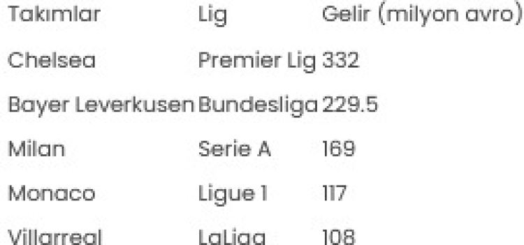 İngiltere'de Chelsea, Almanya'da Bayer Leverkusen, İspanya'da Villarreal, İtalya'da Milan, Fransa'da Monaco liglerinde en fazla gelir elde eden ekipler oldu. Süper Lig'de ise listenin ilk sırasında 36 milyon avro ile Trabzonspor yer alıyor.