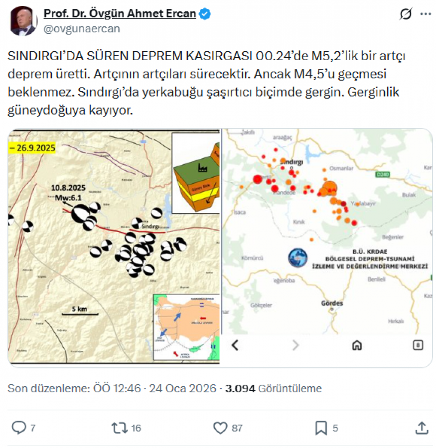 Depremin ardından X hesabı üzerinden açıklama yapan Prof. Dr. Övgün Ercan şu ifadeleri kullandı: